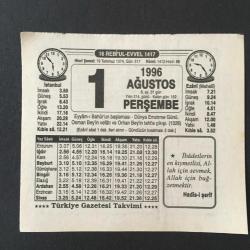 1 AĞUSTOS 1996 -TAKVİM YAPRAĞI-DOĞUM GÜNÜ HEDİYESİ-TÜRKİYE GAZETESİ TAKVİMİ,EYYAMI BAHURUN BAŞLAMASI,DÜNYA EMZİRME GÜNÜ,OSMAN BEYİN VEFATI VE ORHAN BEYİN TAHTA ÇIKIŞI 1326,ORHAN BEYİN VASİYETİ,VENÜS