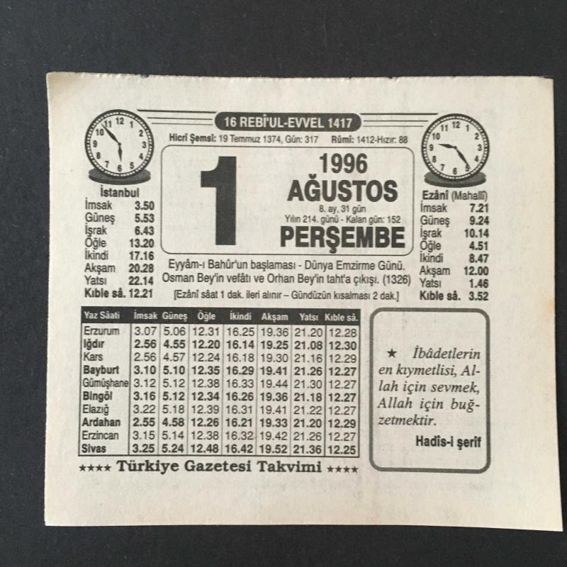 1 AĞUSTOS 1996 -TAKVİM YAPRAĞI-DOĞUM GÜNÜ HEDİYESİ-TÜRKİYE GAZETESİ TAKVİMİ,EYYAMI BAHURUN BAŞLAMASI,DÜNYA EMZİRME GÜNÜ,OSMAN BEYİN VEFATI VE ORHAN BEYİN TAHTA ÇIKIŞI 1326,ORHAN BEYİN VASİYETİ,VENÜS, en son 8 ay önce güncellenmiştir.