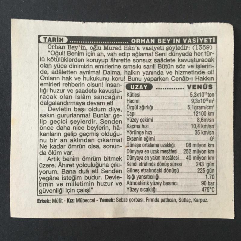1 AĞUSTOS 1996 -TAKVİM YAPRAĞI-DOĞUM GÜNÜ HEDİYESİ-TÜRKİYE GAZETESİ TAKVİMİ,EYYAMI BAHURUN BAŞLAMASI,DÜNYA EMZİRME GÜNÜ,OSMAN BEYİN VEFATI VE ORHAN BEYİN TAHTA ÇIKIŞI 1326,ORHAN BEYİN VASİYETİ,VENÜS başlıklı ürün, Efemera, Müzik, Sinema > Belge ve Evraklar > Takvimler kategorisi altında İkinci El olarak satılmaktadır.
