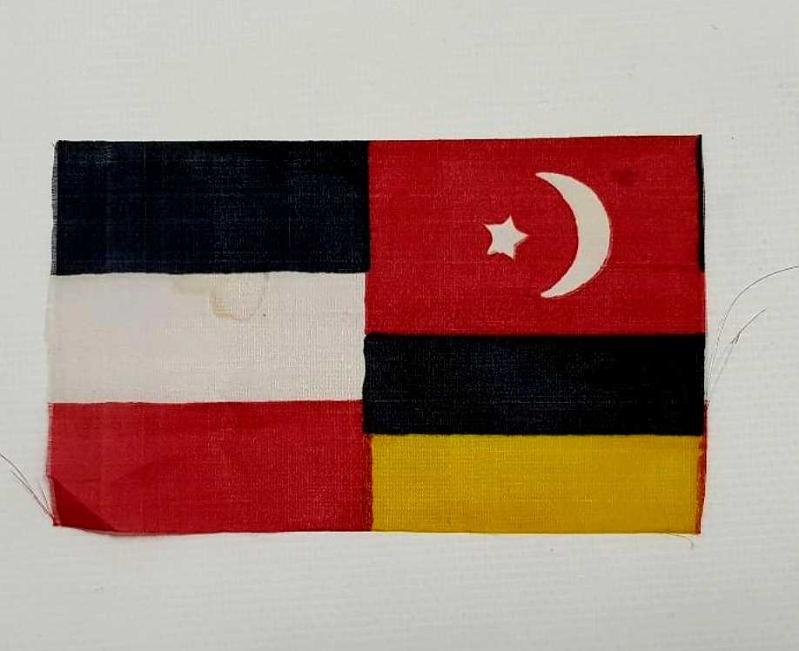 1. DÜNYA SAVAŞI İTTİFAK İPEK BAYRAK ALMANYA, AVUSTURYA MACARİSTAN İMPARATORLUĞU VE OSMANLI İMPARATORLUĞU BAYRAKLARININ BULUNDUĞU İTTİFAK BAYRAĞI. 14 x 8,5 cm.