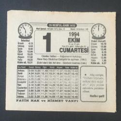 1 EKİM 1994 -TAKVİM YAPRAĞI-DOĞUM GÜNÜ HEDİYESİ-FATİH HAK VE HİZMET VAKFI TAKVİMİ,XAMİLER HAFTASI,KAĞIZMANIN KURTUUŞU,HAVA HARP OKULUNUN ESKİŞEHİRDE AÇILMASI 1951,2.BAYEZID,EĞİLMEK,ABUR CUBUR başlıklı ürün, Efemera, Müzik, Sinema > Belge ve Evraklar > Takvimler kategorisi altında İkinci El olarak satılmaktadır.