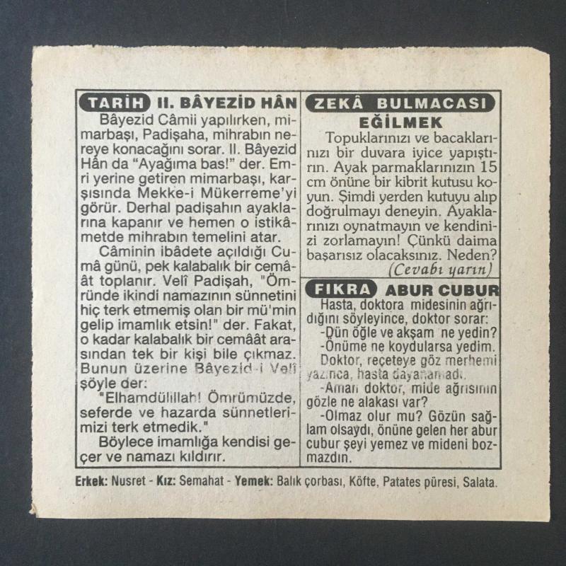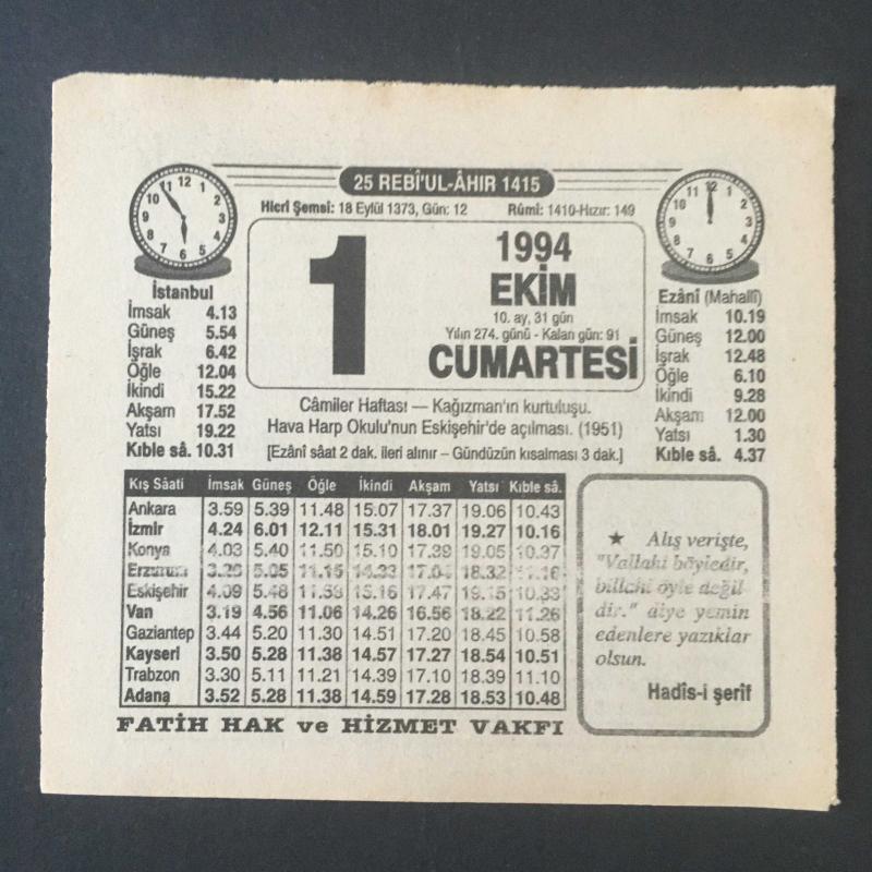 1 EKİM 1994 -TAKVİM YAPRAĞI-DOĞUM GÜNÜ HEDİYESİ-FATİH HAK VE HİZMET VAKFI TAKVİMİ,XAMİLER HAFTASI,KAĞIZMANIN KURTUUŞU,HAVA HARP OKULUNUN ESKİŞEHİRDE AÇILMASI 1951,2.BAYEZID,EĞİLMEK,ABUR CUBUR, en son 8 ay önce güncellenmiştir.