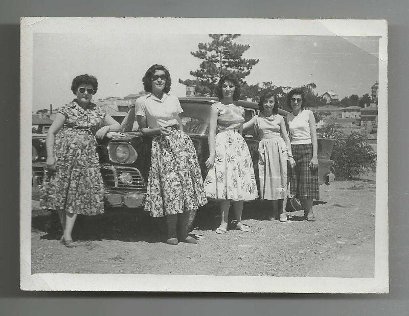 ** 1 ESKİ OTOMOBİL,5 GÜZEL HANIM,5 FARKLI ETEKLİK KÜÇÜK EBAT FOTOĞRAF ** Küçük ebatta ve çok iyi kondüsyonda,arka yüzü yazısız döneminin orijinal fotoğrafıdır..