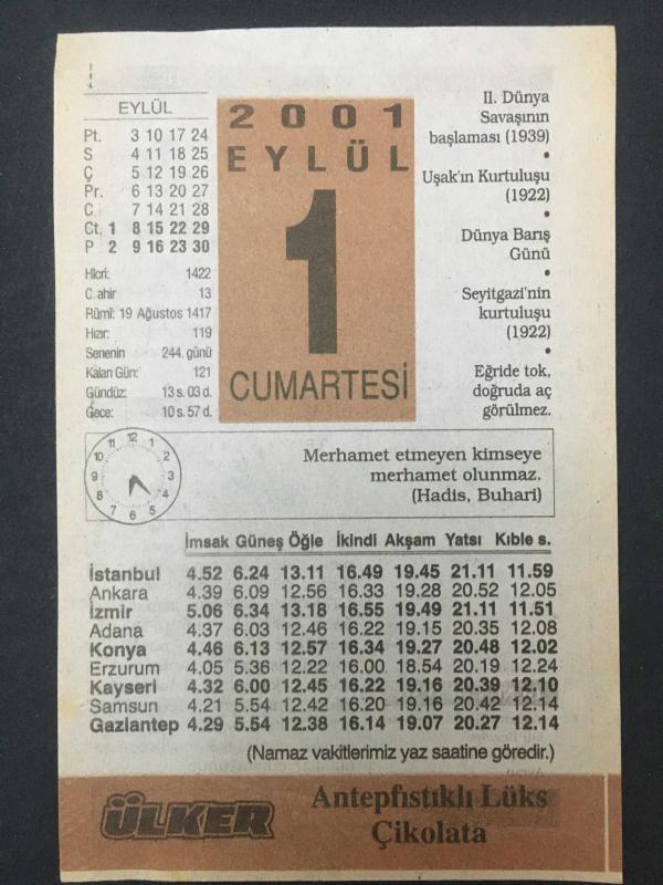 1 EYLÜL 2001-TAKVİM YAPRAĞI-DOĞUM GÜNÜ HEDİYESİ-ÜLKER TAKVİMİ,2.DÜNYA SAVAŞININ BAŞLAMASI 1939,UŞAKIN KURTULUŞU,1922,SEYİTGAZİNİN KURTULUŞU,, en son 8 ay önce güncellenmiştir.