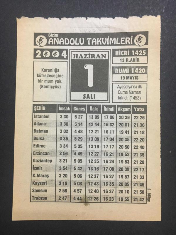 1 HAZİRAN 2004 -TAKVİM YAPRAĞI-DOĞUM GÜNÜ HEDİYESİ-BİZİM ANADOLU TAKVİMLERİ,AYASOFYADA İLK CUMA NAMAZI KILINDI 1453,HZ.ESVED RA başlıklı ürün, Efemera, Müzik, Sinema > Belge ve Evraklar > Takvimler kategorisi altında İkinci El olarak satılmaktadır.