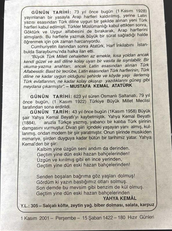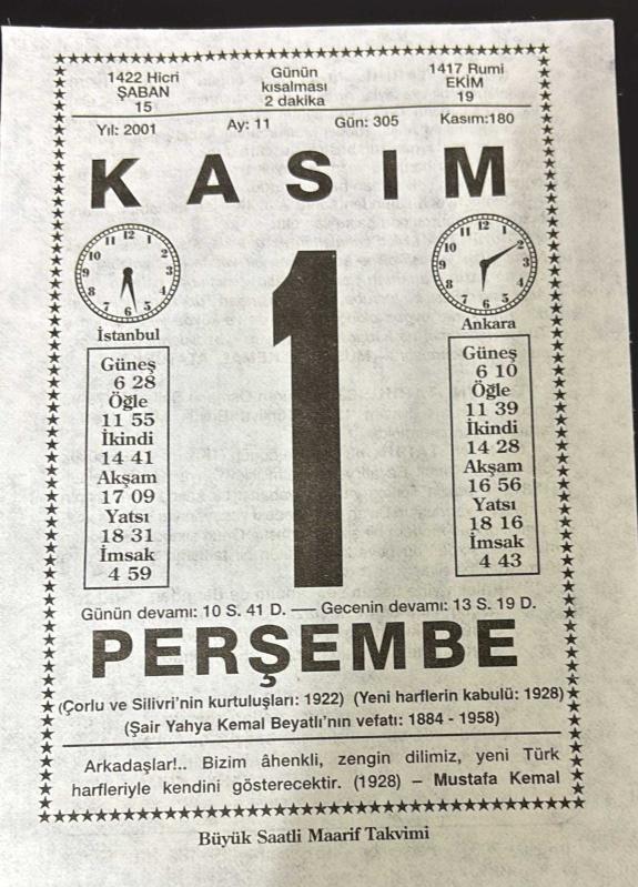 1 KASIM 2001 - TAKVİM YAPRAĞI - DOĞUM GÜNÜ HEDİYESİ - BÜYÜK SAATLİ MAARİF TAKVİMİ - MUSTAFA KEMAL ATATÜRK - OSMANLI SALTANATI TBMM'DE KALDIRILDI - ŞAİR YAHYA KEMAL BEYATLI VEFAT ETTİ - YAHYA KEMAL, en son 8 ay önce güncellenmiştir.