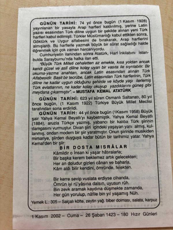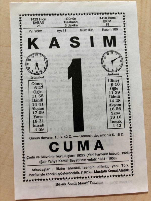 1 KASIM 2002 - TAKVİM YAPRAĞI - DOĞUM GÜNÜ HEDİYESİ - BÜYÜK SAATLİ MAARİF TAKVİMİ - MUSTAFA KEMAL ATATÜRK - OSMANLI SALTANATI TBMM'DE KALDIRILDI - ŞAİR YAHYA KEMAL BEYATLI VEFAT ETTİ - BİR DOSTA MISRALAR, en son 8 ay önce güncellenmiştir.