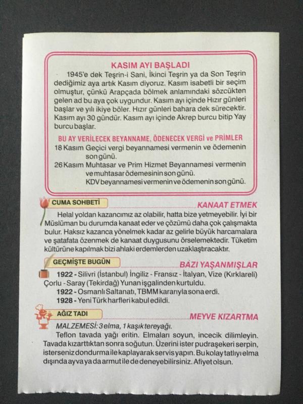 1 KASIM 2024 -TAKVİM YAPRAĞI-DOĞUM GÜNÜ HEDİYESİ-VASIF ÜLKÜ TAKVİMİ,TRABZON UZUNGÖL,YAVRUNUZA İSİM,KASIM AYI BAŞLADI,BU AY VERŞLECEK BEYANNAME,ÖDENECEK VERGİ VE PRİMLER,KANAAT ETMEK,SİLİVRİ İNGİLİZ FRANSIZ İTALYAN VİZE ÇORLU SARAY YUNAN İŞGALİNDEN KURTULDU,1922,SALTANAT SONA ERDİ,1922,YENİ TÜRK HARFLERİ KABUL EDİLDİ 1928,MEYVE KIZARTMA başlıklı ürün, Efemera, Müzik, Sinema > Belge ve Evraklar > Takvimler kategorisi altında İkinci El olarak satılmaktadır.