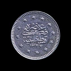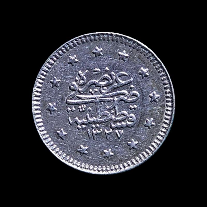 Numarası: KM# 748 Ülke: Osmanlı İmparatorluğu Periyod: Sultan Mehmed V. (1909 - 1918) Hükümdar: Mehmed V. Para Birimi: Osmanlı Lirası Para tipleri: Tedavül madeni paralar Değeri: 1 Kuruş Yıl: AH 1327 (1909) Basım Adedi: 840.000 Kenar: Yivli Şekli: Yuvarlak Hizalama Madalya hizalaması: (0°) Malzeme detayları: Gümüş 0.830 Ağırlık (g): 1,2 Çap (mm): 14,6 Kalınlık: (mm) 1