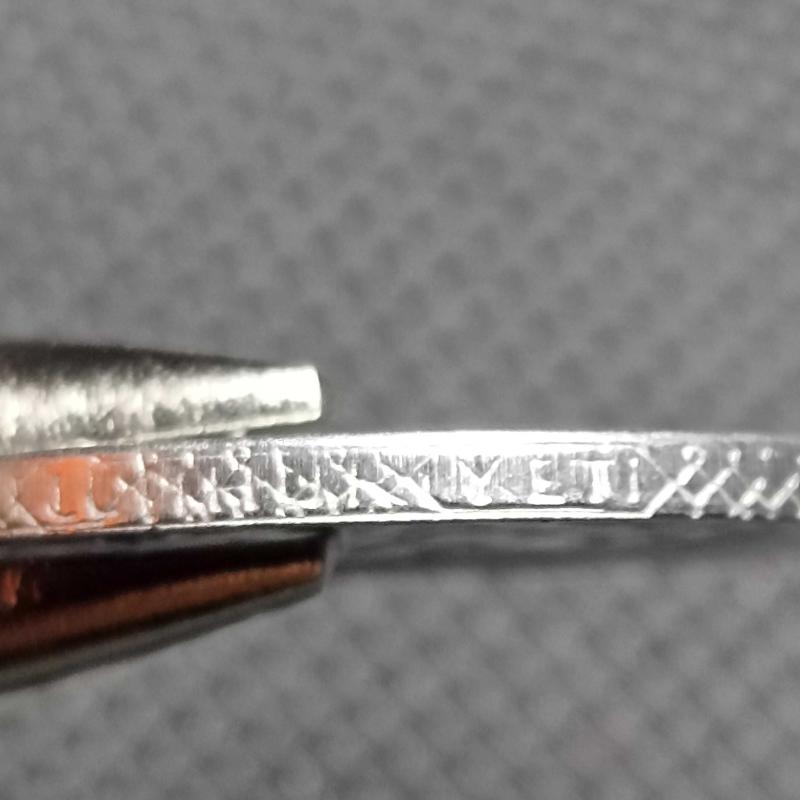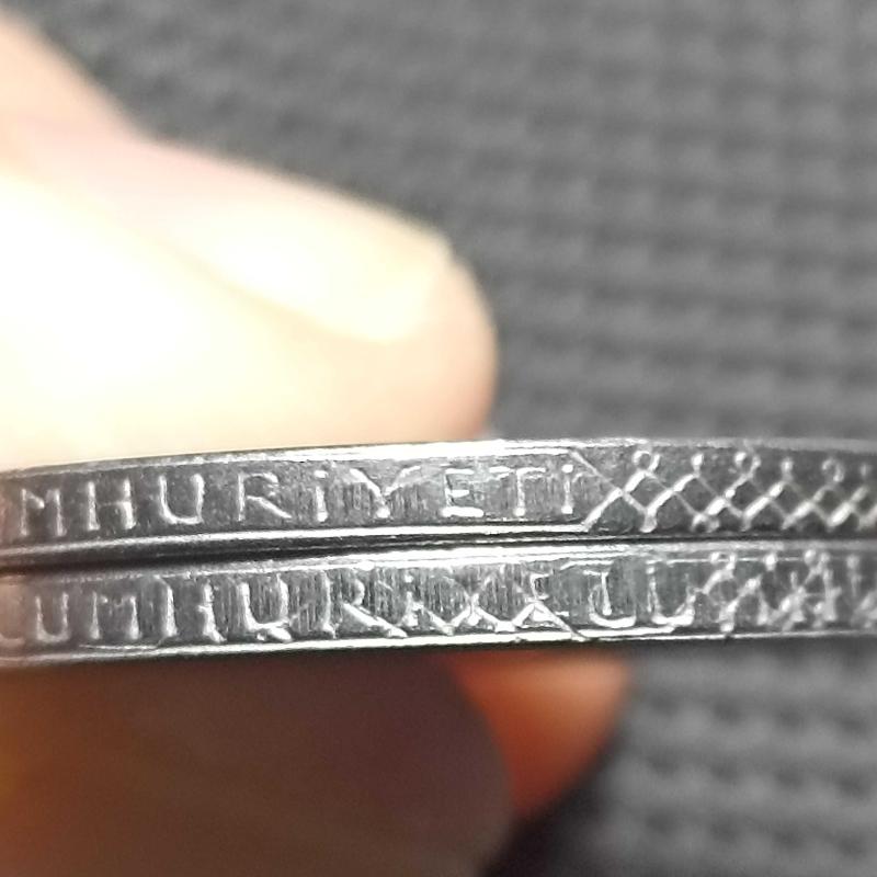 Paranın yan kısımları farklı yerden üst üste basılmış. Yan yana iki defa "CUMHURİYETİ CUMHURİYETİ" gözükmekte Çapraz çizgi desenleri yazılarla üst üste binmiş. Görsellerde normal kenar ile bu paranın hatalı kenarlarını karşılaştırmalı şekilde görebilirsiniz. Görseldeki ürün
