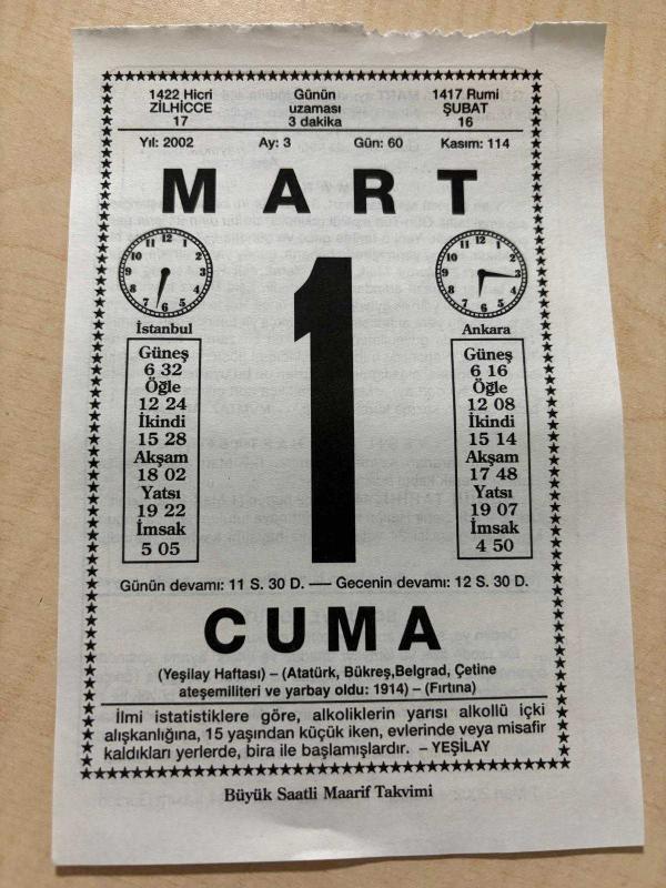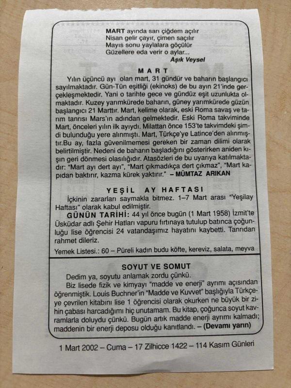 1 MART 2002 - TAKVİM YAPRAĞI - DOĞUM GÜNÜ HEDİYESİ - BÜYÜK SAATLİ MAARİF TAKVİMİ - YEŞİLAY - AŞIK VEYSEL - MÜMTAZ ARIKAN - YEŞİLAY HAFTASI - İZMİT VAPUR KAZASI - SOYUT VE SOMUT ADLI YAZI DİZİSİ, en son 8 ay önce güncellenmiştir.