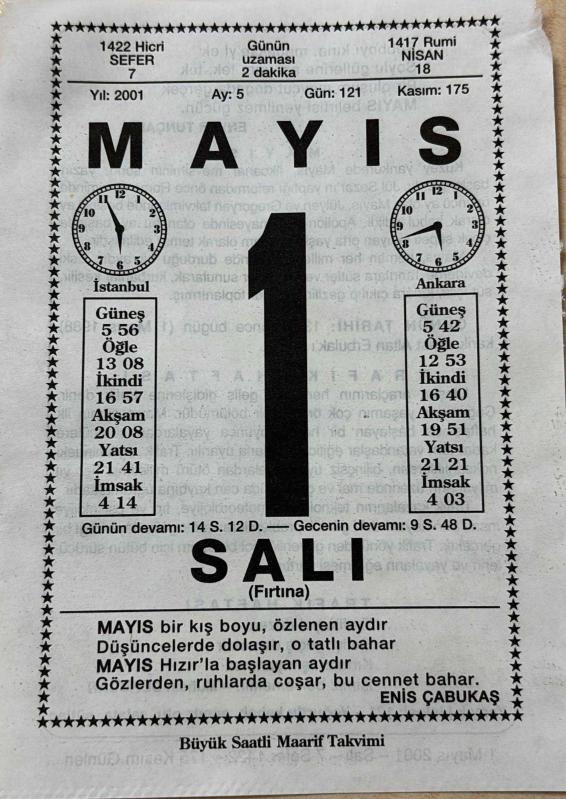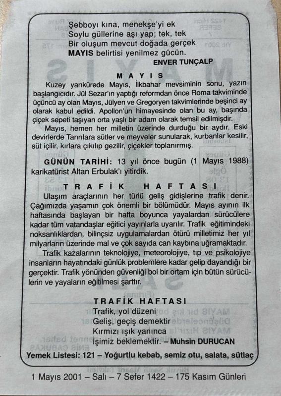 1 MAYIS 2001 - TAKVİM YAPRAĞI - DOĞUM GÜNÜ HEDİYESİ - BÜYÜK SAATLİ MAARİF TAKVİMİ - ENİS ÇABUKAŞ - ENVER TUNÇALP - MAYIS - KARİKATÜRİST ALTAN ERBULAK'IN VEFATI - TRAFİK HAFTASI - MUHSİN DURUCAN, en son 8 ay önce güncellenmiştir.