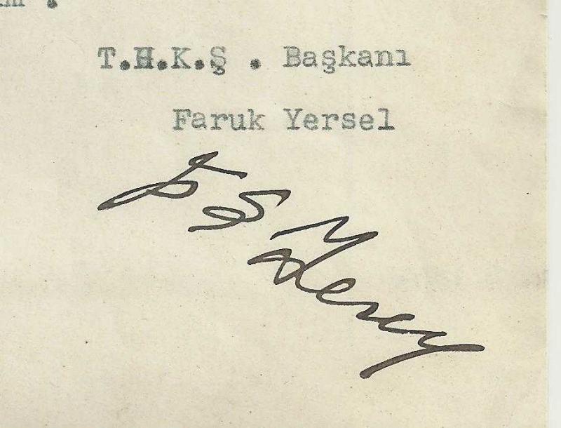 ** T.H.K.Ş. BAŞKANI FARUK YERSEL İMZALI EVRAK ** A4 ebadında,arka yüzü yazısız,daktiloyla yazılmış, gayet temiz durumda,bir yazının ikinci sayfası olarak çıkmış, en altta başkan ıslak imzalı yazışmadır...
