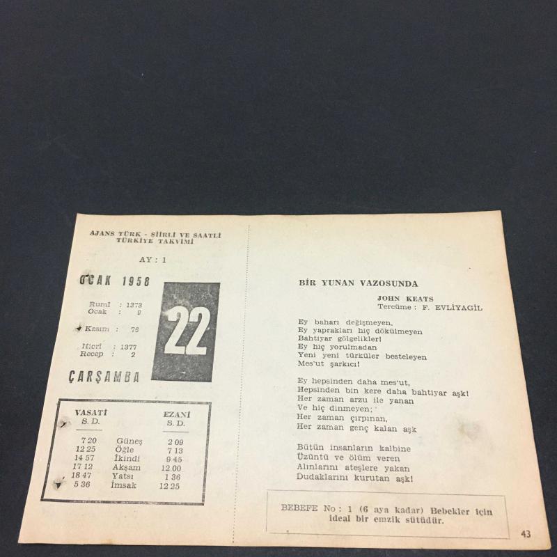 1 OCAK 1958-TAKVİM YAPRAĞI-DOĞUM GÜNÜ HEDİYESİ-AJANS TÜRK-ŞİİRLİ VE SAATLİ TÜRKİYE TAKVİMİ,JOHN KEATS,RABİA HATUN,FAL,FIKRA,RİDANİYE SAVAŞI,1517,GÜZEL SÖZ,YEMEK LİSTESİ başlıklı ürün, Efemera, Müzik, Sinema > Belge ve Evraklar > Takvimler kategorisi altında İkinci El olarak satılmaktadır.