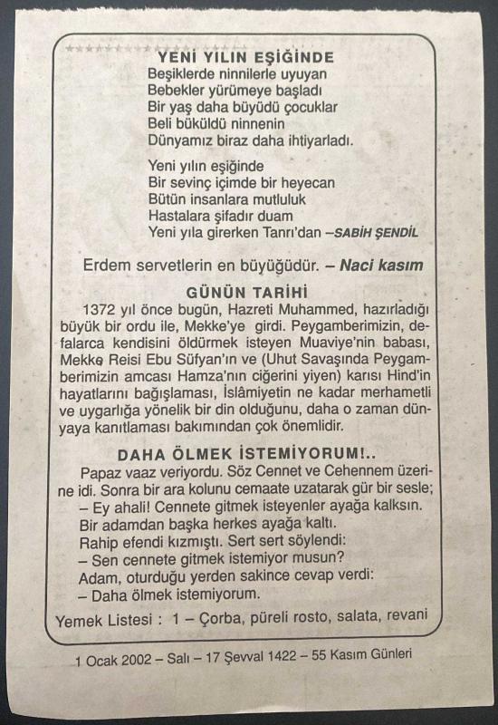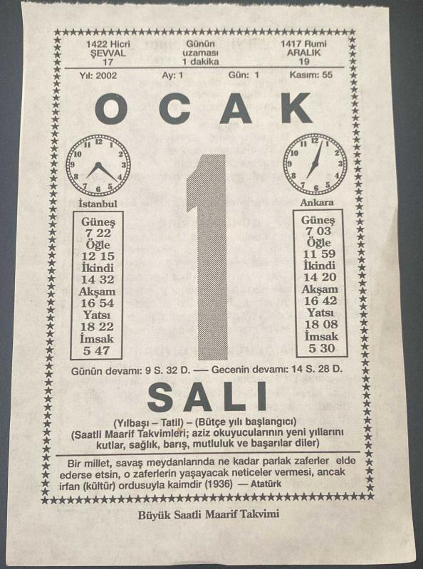 1 OCAK 2002 - TAKVİM YAPRAĞI - DOĞUM GÜNÜ HEDİYESİ - BÜYÜK SAATLİ MAARİF TAKVİMİ - ATATÜRK - SABİH ŞENDİL - NACİ KASIM - HZ. MUHAMMED'İN MEKKEYE GİRİŞİ - DAHA ÖLMEK İSTEMİYORUM ADLI KISA YAZI, en son 8 ay önce güncellenmiştir.