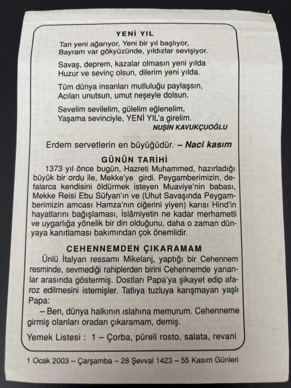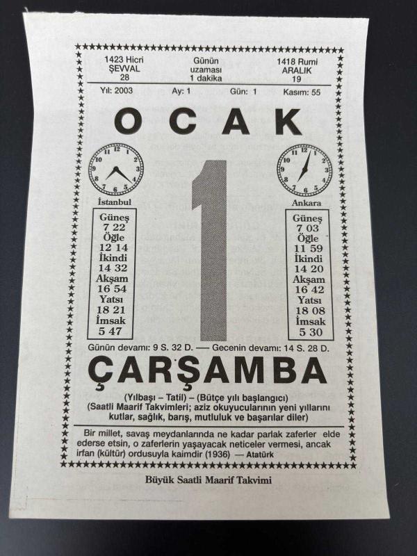 1 OCAK 2003 - TAKVİM YAPRAĞI - DOĞUM GÜNÜ HEDİYESİ - BÜYÜK SAATLİ MAARİF TAKVİMİ - ATATÜRK - NUŞİN KAVUKÇUOĞLU - NACİ KASIM - HZ. MUHAMMED'İN MEKKEYE GİRİŞİ - CEHENNEMDEN ÇIKARAMAM ADLI KISA YAZI, 7 ay önce satışa sunulmuştur.