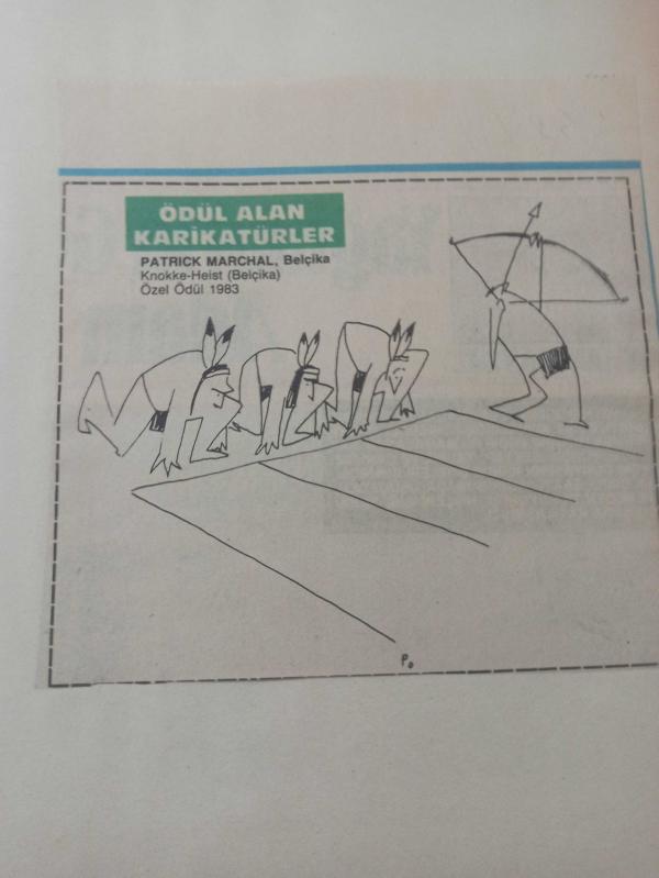 1 Ocak 1984 - Ödül Alan Karikatürler - Patrick Marchal, Belçika - Atletizm'de koşu yapan Kızılderililer karikatürü - Gazete haberi - Tek Yaprak Arkalı Önlüdür, Erol Duru tarafından kaleme alınmıştır. Kitap 1984 yılında yayınlanmıştır. 2 sayfadır. 1 Ocak 1984 - Ödül Alan Karikatürler - Patrick Marchal, Belçika - Atletizm'de koşu yapan Kızılderililer karikatürü - Gazete haberi - Tek Yaprak Arkalı Önlüdür adlı eser Türkçe dilindedir.