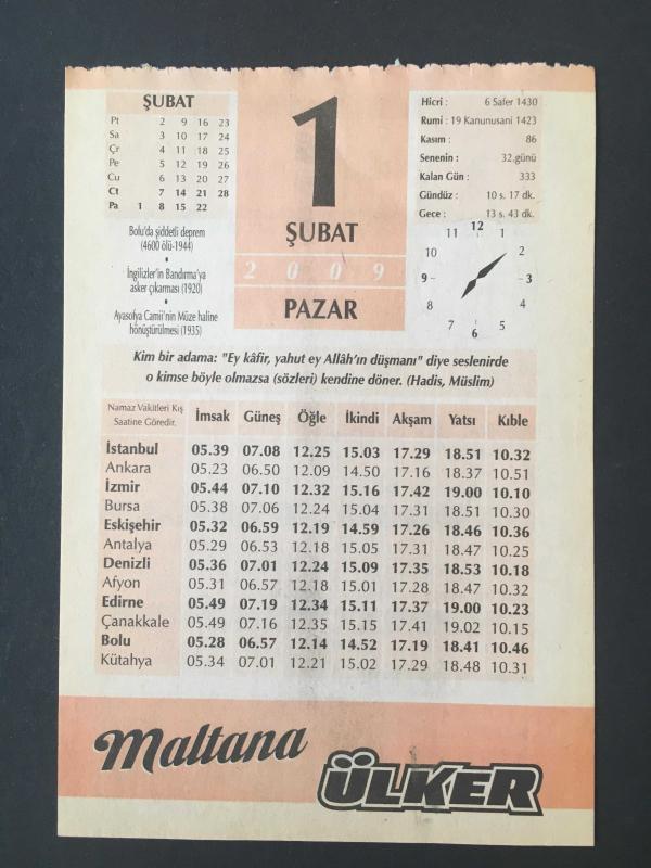 1 ŞUBAT 2009-TAKVİM YAPRAĞI-DOĞUM GÜNÜ HEDİYESİ-ÜLKER TAKVİMİ,BOLUDA ŞİDDETLİ DEPREM,4600 ÖLÜ,1944,İNGİLİZLERİB BANDIRMAYA ASKER ÇIKARMASI 1920,AYASOFYA CAMİİNİN MÜZE HALİNE DÖNÜŞTÜRÜLMESİ 1935,ÇOCUĞUNUZUN İSMİ REYHAN,SAĞLIK KÜRESEL ISINMA,HAVA DURUMU, en son 8 ay önce güncellenmiştir.