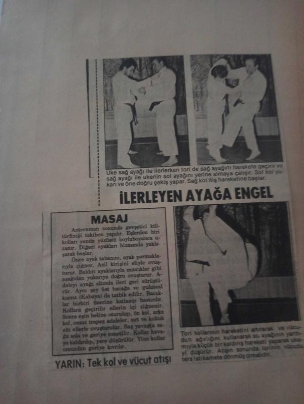 1 Şubat 1984 - Judo Öğretiyoruz - İlerleye ayağa engel - Uke sağ ayağı ile ilerlerken Tori de sağ ayağını harekete geçirir ve sağ ayağı ile Uke'nin sol ayağını yerine almaya çalışır - Gazete haberi - Tek Yaprak Arkalı Önlüdür, Erol Duru tarafından kaleme alınmıştır. Kitap 1984 yılında yayınlanmıştır. 2 sayfadır. 1 Şubat 1984 - Judo Öğretiyoruz - İlerleye ayağa engel - Uke sağ ayağı ile ilerlerken Tori de sağ ayağını harekete geçirir ve sağ ayağı ile Uke'nin sol ayağını yerine almaya çalışır - Gazete haberi - Tek Yaprak Arkalı Önlüdür adlı eser Türkçe dilindedir.