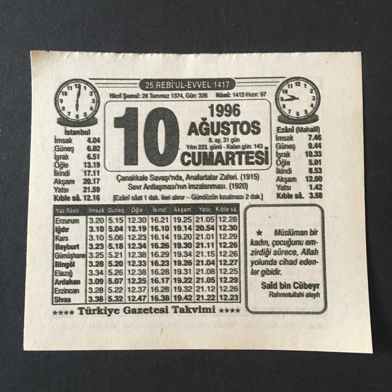 10 AĞUSTOS 1996 -TAKVİM YAPRAĞI-DOĞUM GÜNÜ HEDİYESİ-TÜRKİYE GAZETESİ TAKVİMİ,ÇANAKKALE SAVAŞINDA ANAFARTALAR ZAFERİ,1915,SEVR ANTLAŞMASININ İMZALANMASI 1920,BOSNALI KOMUTAN,ÇOBAN VE KÖPEK başlıklı ürün, Efemera, Müzik, Sinema > Belge ve Evraklar > Takvimler kategorisi altında İkinci El olarak satılmaktadır.