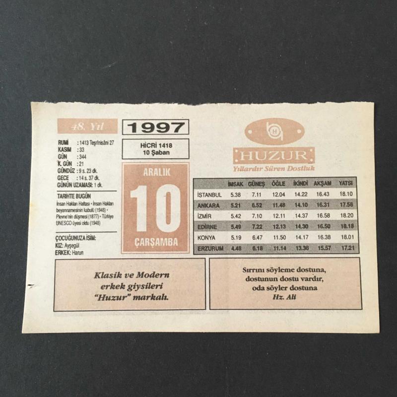 10 ARALIK 1997-TAKVİM YAPRAĞI-DOĞUM GÜNÜ HEDİYESİ-HUZUR TAKVİMİ,İNSAN HAKLARI HAFTASI,İNSAN HAKLARI BEYANNAMESİNİN KABULÜ,1948,PLEVNENİN DÜŞMESİ,1877,TÜRKİYE UNESCO ÜYESİ OLDU 1948,ÇOCUĞUNUZA İSİM,İLİM VE AMEL,EN UZUN İSİM, 1 yıl önce satışa sunulmuştur.