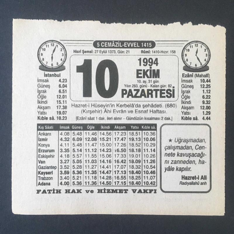 10 EKİM 1994 -TAKVİM YAPRAĞI-DOĞUM GÜNÜ HEDİYESİ-FATİH HAK VE HİZMET VAKFI TAKVİMİ,HZ.HÜSEYİNİN KERBELA DA ŞEHADETİ 680,KIRŞEHİR AHİ EVRAN VE ESNAF HAFTASI,EL-TURCO başlıklı ürün, Efemera, Müzik, Sinema > Belge ve Evraklar > Takvimler kategorisi altında İkinci El olarak satılmaktadır.