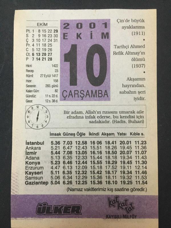 10 EKİM 2001-TAKVİM YAPRAĞI-DOĞUM GÜNÜ HEDİYESİ-ÜLKER TAKVİMİ,ÇİNDE BÜYÜK AYAKLANMA 1911,TARİHÇİ AHMED REFİK ALTINAYIN ÖLÜMÜ,1937,EN UZUN BOYLU, en son 8 ay önce güncellenmiştir.