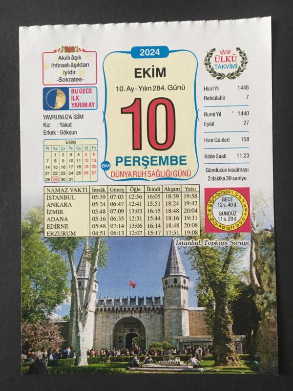 10 EKİM 2024 -TAKVİM YAPRAĞI-DOĞUM GÜNÜ HEDİYESİ-VASIF ÜLKÜ TAKVİMİ,İSTANBUL TOPKAPI SARAYI,YAVRUNUZA İSİM,BUGÜNKÜ AYASOFYA 3.KEZ İNŞA EDİLDİ,415,KERBELA VAKASI OLDU 680,ANKARADA TERÖR SALDIRISI SONUCU 107 İNSAN ÖLDÜ 2015,İNSAN DOĞAYA ÜSTÜN MÜ,KUTSAL İNEK,ALTIN DİZELER başlıklı ürün, Efemera, Müzik, Sinema > Belge ve Evraklar > Takvimler kategorisi altında İkinci El olarak satılmaktadır.