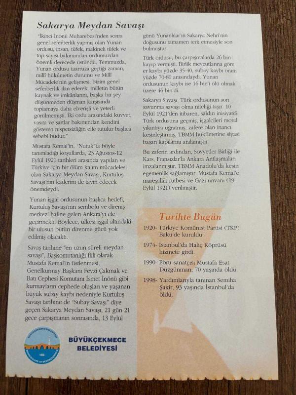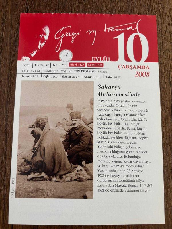 10 EYLÜL 2008 - TAKVİM YAPRAĞI - DOĞUM GÜNÜ HEDİYESİ - GAZİ MUSTAFA KEMAL ATATÜRK FOTOĞRAFLI BÜYÜKÇEKMECE BELEDİYESİ TAKVİMİ - Sakarya Muharebesi'nde - Sakarya Meydan Savaşı -1920- Türkiye Komünist Partisi (TKP) Bakü'de kuruldu.- 1974- İstanbul'da Haliç Köprüsü hizmete girdi- 1998- Yardımlarıyla tanınan Semiha Şakir, 93 yaşında İstanbul'da öldü., en son 9 ay önce güncellenmiştir.