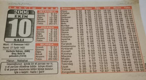 10 Ekim 2006-Orijinal Takvim Yaprağı-Doğum Günü-Söz,Nişan,Nikâh,Düğün ve Önemli Günler Hediyesi-Bizim Anadolu Takvimleri-Ayet(Hadis-i Şerif)-Kerbela Vakası (680)-Harun,Nebahat-Yavuz Sultan Selim, en son bir ay önce güncellenmiştir.