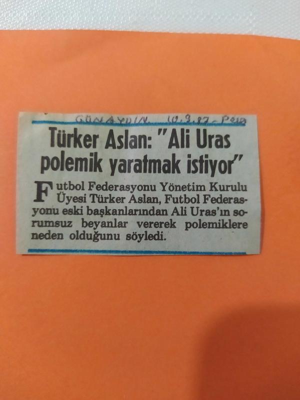 Kitap 1987 yılında yayınlanmıştır. 10 Eylül 1987 - Günaydın Gazetesi - Türker Aslan: ''Ali Uras polemik yaratmak istiyor'' - TFF Yönetim Kurulu üyesi Türker Aslan, Futbol Federasyonu eski başkanlarından Ali Uras'ın sorumsuz beyanlar verdiğini söyledi - Gazete tam değil kupürüdür - 6x3cm ebatındadır.. adlı eser Türkçe dilindedir.