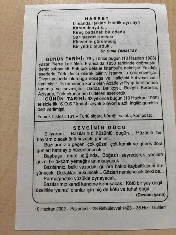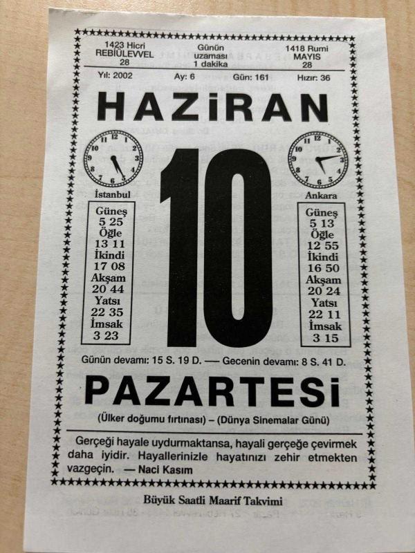 10 HAZİRAN 2002 - TAKVİM YAPRAĞI - DOĞUM GÜNÜ HEDİYESİ - BÜYÜK SAATLİ MAARİF TAKVİMİ - NACİ KASIM - DR.SUNA TANALTAY - YAZAR PİERRE LOTİ'NİN VEFATI - TELSİZLE İLK S.O.S. İMDAT SİNYALİ SLAVONİA ADLI GEMİDEN VERİLMİŞTİR - SEVGİNİN GÜCÜ ADLI YAZI DİZİSİ, en son 8 ay önce güncellenmiştir.