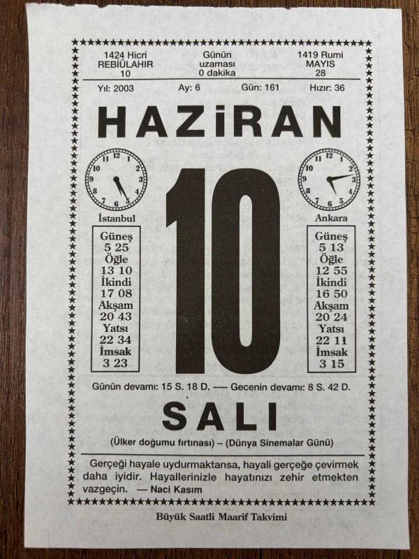10 HAZİRAN 2003 - TAKVİM YAPRAĞI - DOĞUM GÜNÜ HEDİYESİ - BÜYÜK SAATLİ MAARİF TAKVİMİ - NACİ KASIM - YETKİN ARÖZ - YAZAR PİERRE LOTİ'NİN VEFATI - TELSİZLE İLK S.O.S. İMDAT SİNYALİ SLAVONİA ADLI GEMİDEN VERİLMİŞTİR - EVLİLİKTE DALGINLIK