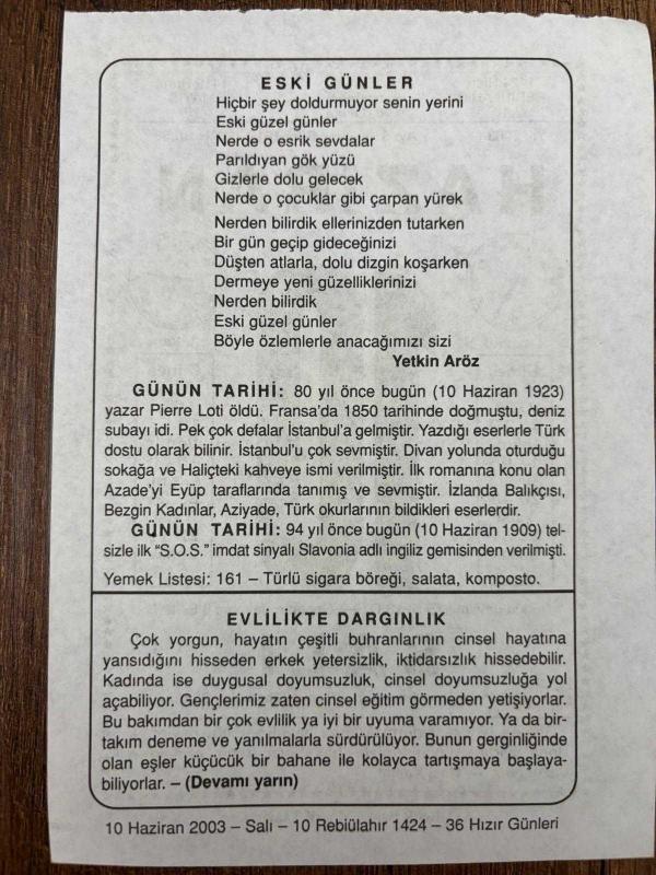 10 HAZİRAN 2003 - TAKVİM YAPRAĞI - DOĞUM GÜNÜ HEDİYESİ - BÜYÜK SAATLİ MAARİF TAKVİMİ - NACİ KASIM - YETKİN ARÖZ - YAZAR PİERRE LOTİ'NİN VEFATI - TELSİZLE İLK S.O.S. İMDAT SİNYALİ SLAVONİA ADLI GEMİDEN VERİLMİŞTİR - EVLİLİKTE DALGINLIK, en son 8 ay önce güncellenmiştir.