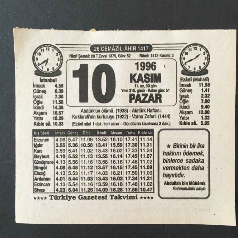 10 KASIM 1996 -TAKVİM YAPRAĞI-DOĞUM GÜNÜ HEDİYESİ-TÜRKİYE GAZETESİ TAKVİMİ,ATATÜRK ÜN ÖLÜMÜ,1938,ATATÜRK HAFTASI,KIRLARELİNİN KURTULUŞU,1922,VARNA ZAFERİ 1444,MANZUM ATASÖZLERİ, başlıklı ürün, Efemera, Müzik, Sinema > Belge ve Evraklar > Takvimler kategorisi altında İkinci El olarak satılmaktadır.