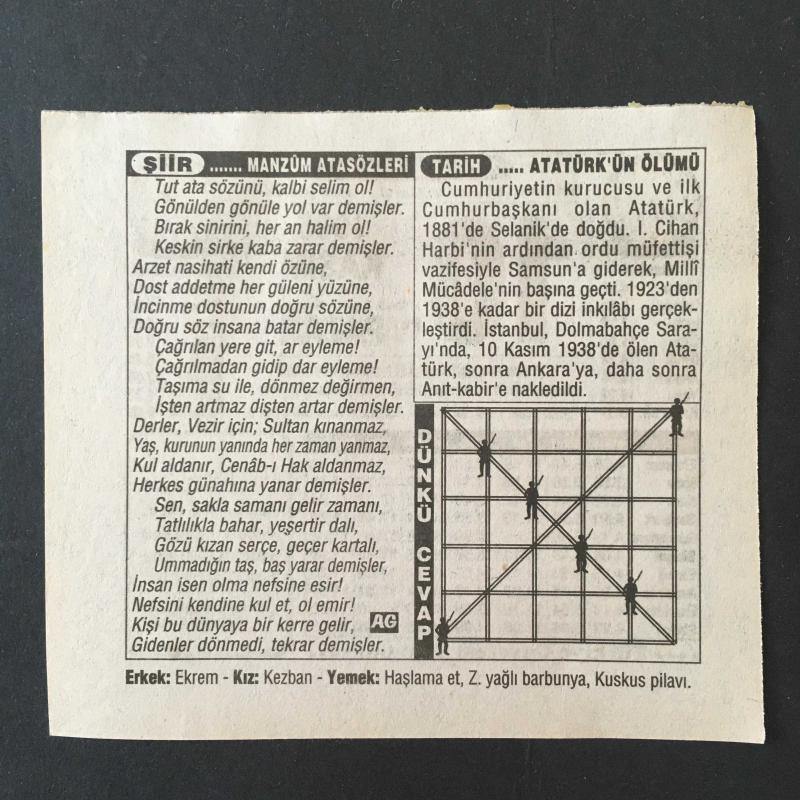 Gazeteler,dergiler,kitaplar harika hediyelerdir.Otantik,orijinal,nadir ve eski gazeteler,dergiler,kitaplar,efemeralar,objeler.Gazeteler bir aynadır.Kitaplar sadece okumak için değil birlikte yaşamak içindir . Kelimeler , notalar ,  sayılar kardeştirler.Kitaplar insanı binbir gözlü yapar.