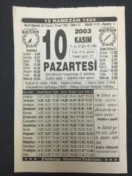 10 KASIM 2003-TAKVİM YAPRAĞI-DOĞUM GÜNÜ HEDİYESİ-TÜRKİYE GAZETESİ TAKVİMİ,ATATÜRKÜN VEFATI 1938,ATATÜRK HAFTASI,1.VARNA ZAFERİ,1444,KIRKLARELİNİN KURTULUŞU,1922,DÜNYA ÇOCUK KİTAPLARI HAFTASI,ZİMEM DEFTERİ