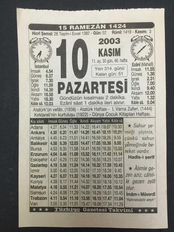 10 KASIM 2003-TAKVİM YAPRAĞI-DOĞUM GÜNÜ HEDİYESİ-TÜRKİYE GAZETESİ TAKVİMİ,ATATÜRKÜN VEFATI 1938,ATATÜRK HAFTASI,1.VARNA ZAFERİ,1444,KIRKLARELİNİN KURTULUŞU,1922,DÜNYA ÇOCUK KİTAPLARI HAFTASI,ZİMEM DEFTERİ, en son 8 ay önce güncellenmiştir.