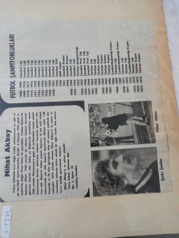 10 Kasım 1981 - Nihat Akbay - Yalnız Galatasaray'ın değil, futbol sahalarımızın en eski ve en tecrübeli oyuncularından biridir - Boş zamanlarını evinde geçirmekten hoşlanıyor - Şevki Şenlen - Futbol Şampiyonlukları - Gazete haberi - Tek Yaprak Arkalı Önlüdür adlı eser, Kitap > Süreli Yayınlar > Dergiler > Spor kategorisinde İkinci El olarak satıştadır.