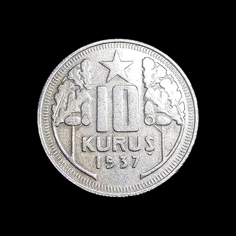 Para : 10 kuruş Hicri : 1937 Dönem : 1935-1940 Miladi : 1937 KM# : 863 Kondisyon : ÇT Condition : VF-35 Basım Adedi : 3,020,000 Darphane : İstanbul Maden : Bakır - Nikel Çap : 25.5 Ağırlık (gr.) : 5.8