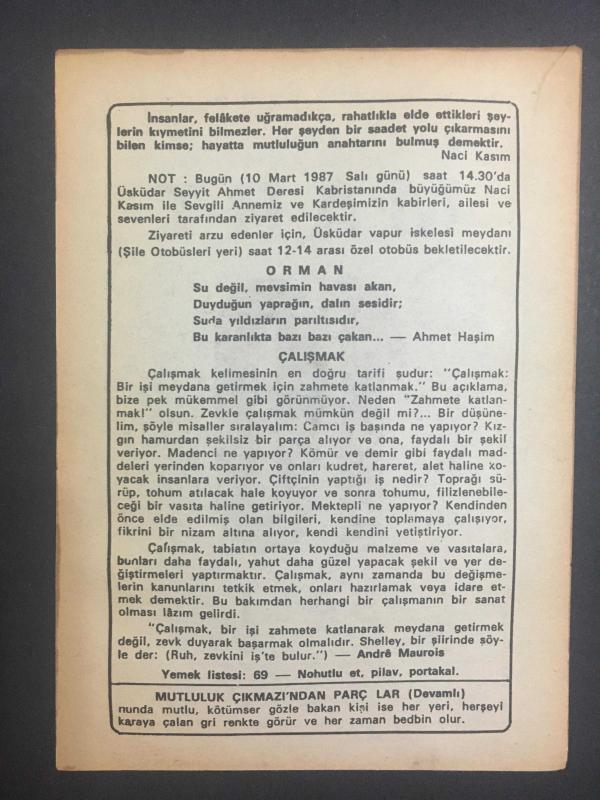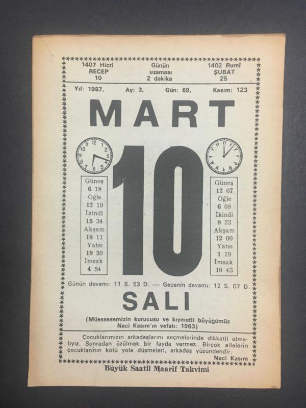 10 MART 1987 -TAKVİM YAPRAĞI-DOĞUM GÜNÜ HEDİYESİ-BÜYÜK SAATLİ MAARİF TAKVİMİ,NACİ KASIMIN VEFATI 1963,ORMAN,ÇALIŞMAK,MUTLULUK ÇIKMAZINDAN PARÇALAR, 1 yıl önce satışa sunulmuştur.