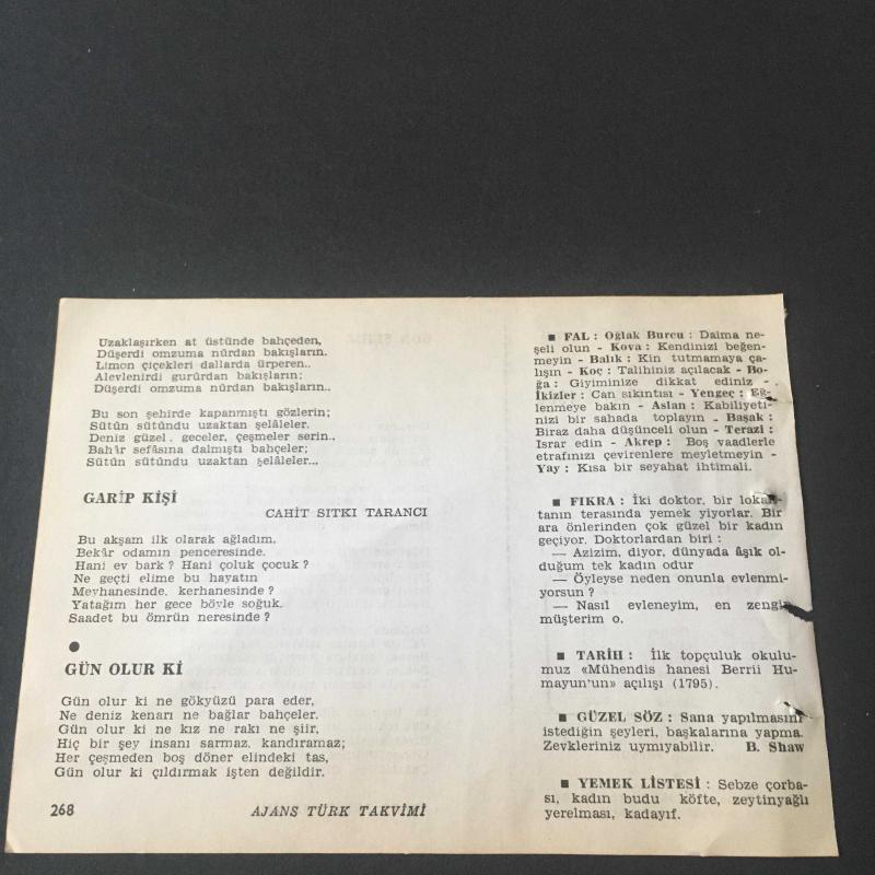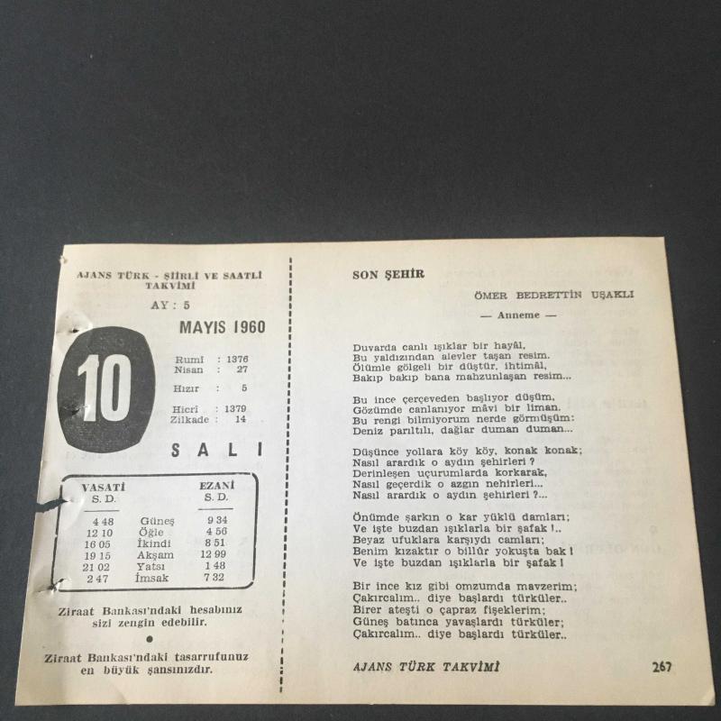 10 MAYIS 1960-TAKVİM YAPRAĞI-DOĞUM GÜNÜ HEDİYESİ- AJANS TÜRK-ŞİİRLİ VE SAATLİ TAKVİMİ,ÖMER BEDRETTİN UŞAKLI,CAHİT SITKI TARANCI,FAL,FIKRA,İLK TOPÇULUK OKULUMUZ MÜHENDİS HANESİ BERRİİ HÜMAYUN UN AÇILIŞI 1795,GÜZEL SÖZ,YEMEK LİSTESİ, 1 yıl önce satışa sunulmuştur.