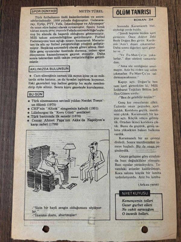 10 MAYIS 1979 - TAKVİM YAPRAĞI - DOĞUM GÜNÜ HEDİYESİ - HÜRRİYET TAKVİMİ - ÖLÜM TANRISI ROMANI - Türk sinemasının sevimli yıldızı Necdet Tosun' un ölümü (1975) - CHP'nin "Altıok" simgesinin kabulü (1931) - Lüleburgaz'da "Koru Günü" şenlikleri - Türk basınında ilk sansür (1876), en son 8 ay önce güncellenmiştir.