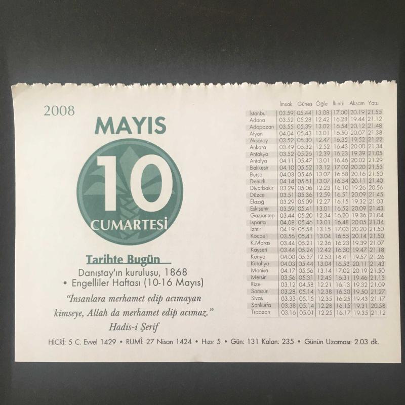 10 MAYIS 2008 -TAKVİM YAPRAĞI-DOĞUM GÜNÜ HEDİYESİ-KUVEYT TÜRK TAKVİMİ,DANIŞTAYIN KURULUŞU,1968,ENGELLİLER HAFTASI 10-16 MAYIS,NE TABİBLER VAR,KISSADAN HİSSE,HIRS GÖSTEREN KAYBEDER,PRATİK BİLGİLER, en son 8 ay önce güncellenmiştir.