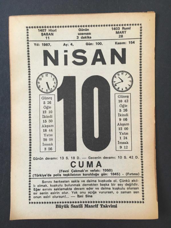 10 NİSAN 1987 -TAKVİM YAPRAĞI-DOĞUM GÜNÜ HEDİYESİ-BÜYÜK SAATLİ MAARİF TAKVİMİ,FEVZİ ÇAKMAKIN FEVATI 1950,TÜRKİYEDE POLİS TEŞKİLATININ KURULDUĞU GÜN 1845,DUMLUPINARDA ŞİİRİNDEN,NİSAN AYINDA,VOLTAİRE DEN başlıklı ürün, Efemera, Müzik, Sinema > Belge ve Evraklar > Takvimler kategorisi altında İkinci El olarak satılmaktadır.