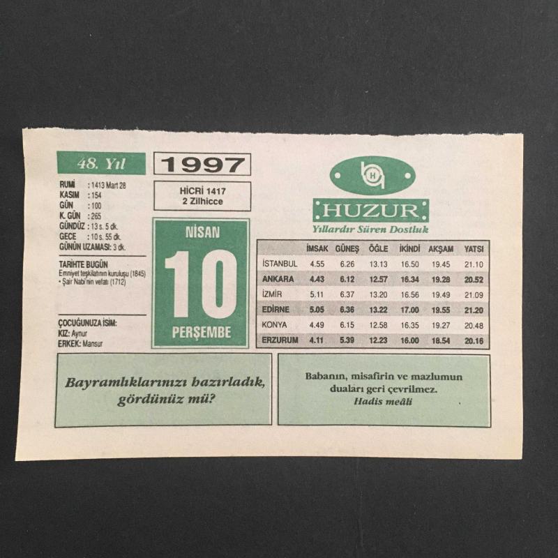 10 NİSAN 1997 -TAKVİM YAPRAĞI-DOĞUM GÜNÜ HEDİYESİ-HUZUR TAKVİMİ,EMNİYET TEŞKİLATININ KURULUŞU 1845,NABİNİN VEFATI 1712,ÇOCUĞUNUZA İSİM,KENDİMİ BEĞENİR OLDUM,SADAKATİN ALAMETLERİ, 1 yıl önce satışa sunulmuştur.