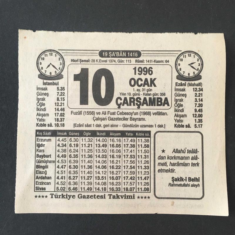 10 OCAK 1996-TAKVİM YAPRAĞI-DOĞUM GÜNÜ HEDİYESİ-TÜRKİYE GAZETESİ TAKVİMİ,FUZULİ 1556,VE ALİ FUAT CEBESOYUN 1968 VEFATLARI,ÇALIŞAN GAZATECİLER BAYRAMI başlıklı ürün, Efemera, Müzik, Sinema > Belge ve Evraklar > Takvimler kategorisi altında İkinci El olarak satılmaktadır.