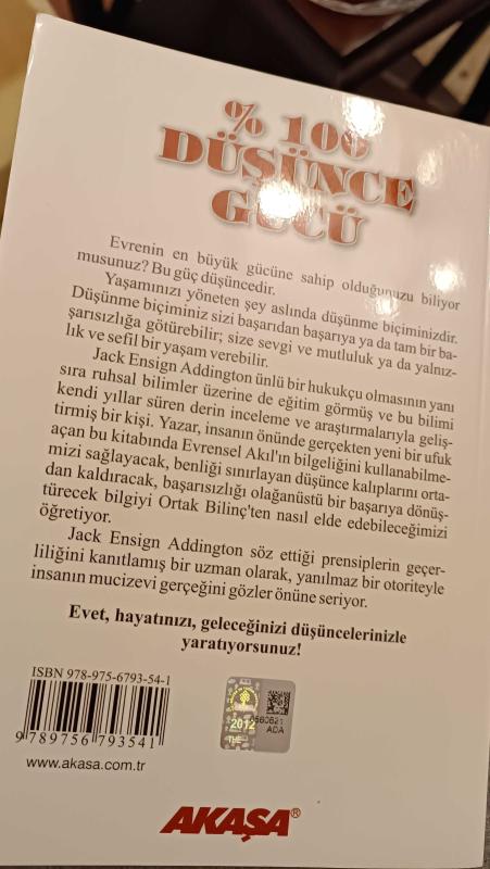 % 100 Düşünce Gücü, JACK ENSING ADDINGTON tarafından kaleme alınmıştır. Kitap 2016 yılında AKAŞA tarafından [İST.] yayınlanmıştır. Satışta olan kitap, yayınevinin 15. baskısıdır. Bu baskının çevirisi SEMRA AYANBAŞI tarafından yapılmıştır. 222 sayfadır. Sayfa bilgisi EKSİKSİZ olarak belirtilmiştir. % 100 Düşünce Gücü adlı eser Türkçe dilindedir.