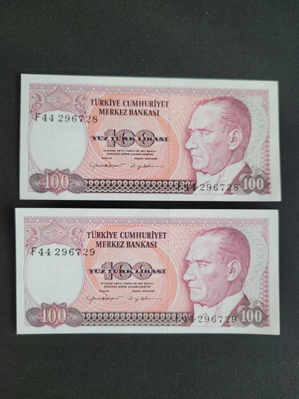 100 TL, 7.Emisyon, Çil 2 adet Seri Takipli başlıklı ürün, Efemera, Müzik, Sinema > Nümismatik, Para, Madalya > Kağıt Paralar > Cumhuriyet Dönemi > 7. Emisyon kategorisi altında İkinci El olarak satılmaktadır.