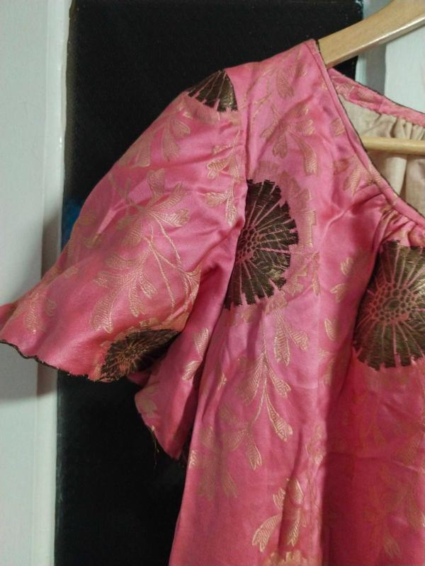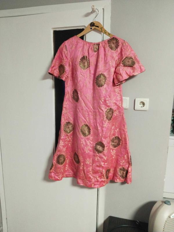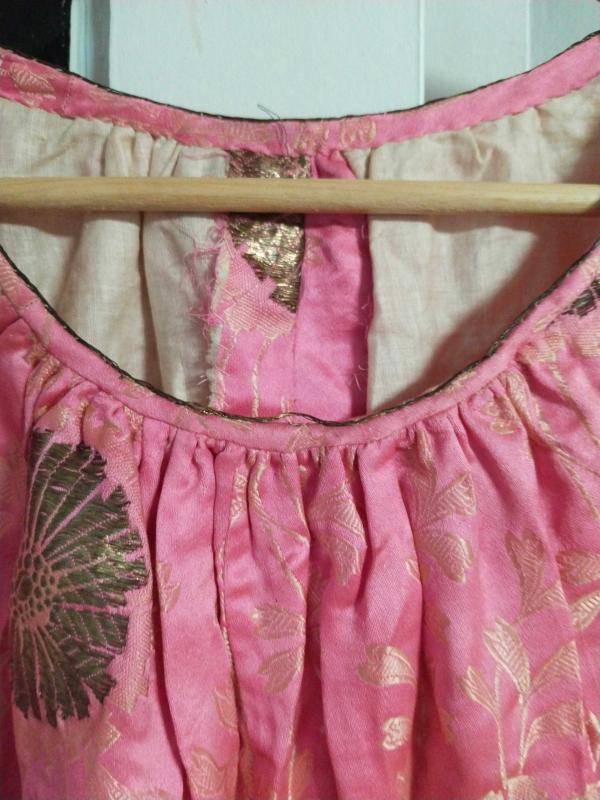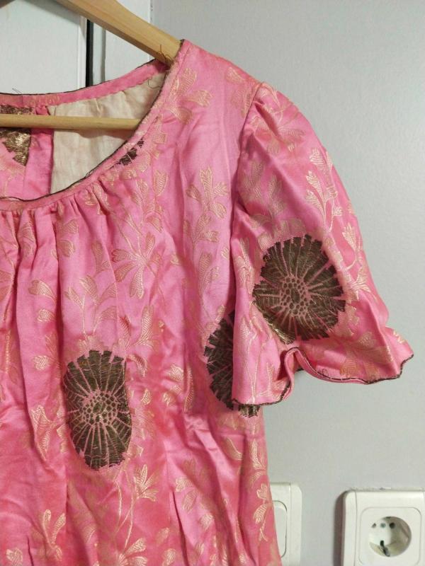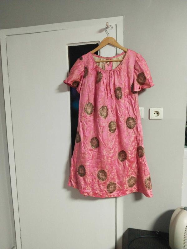 üzeri tel kırma iscilikli desenli muhtemelen çocuk elbisesi omuz dikişinden omuz dikişine 37 cm eni boyundan etek ucuna boyu 99 cm yaşına göre çok diri bir elbise